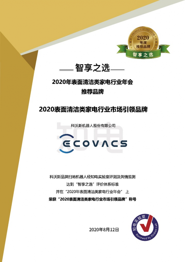 新冠疫情不仅唤醒了消费者对于健康的重视,也让“宅家”成为今年的关键词。作为家居生活中必不可少健康家电,表面清洁类家电自然成为消费者关注的重点对象。近日,由知电与中国家用电器研究院联合主办的“2020年表面清洁类家电行业年会”在北京召开,年会以“汇聚行业精英、促进技术交流、加深商务合作、推动行业发展”为宗旨,致力于打造中国清洁器具家电技术交流与商务合作平台。同时,本次大会上发布了2020表面清洁类家电智享之选年度推荐榜单,科沃斯荣获2020年表面清洁类家电 “智享之选”年度推荐品牌奖。
